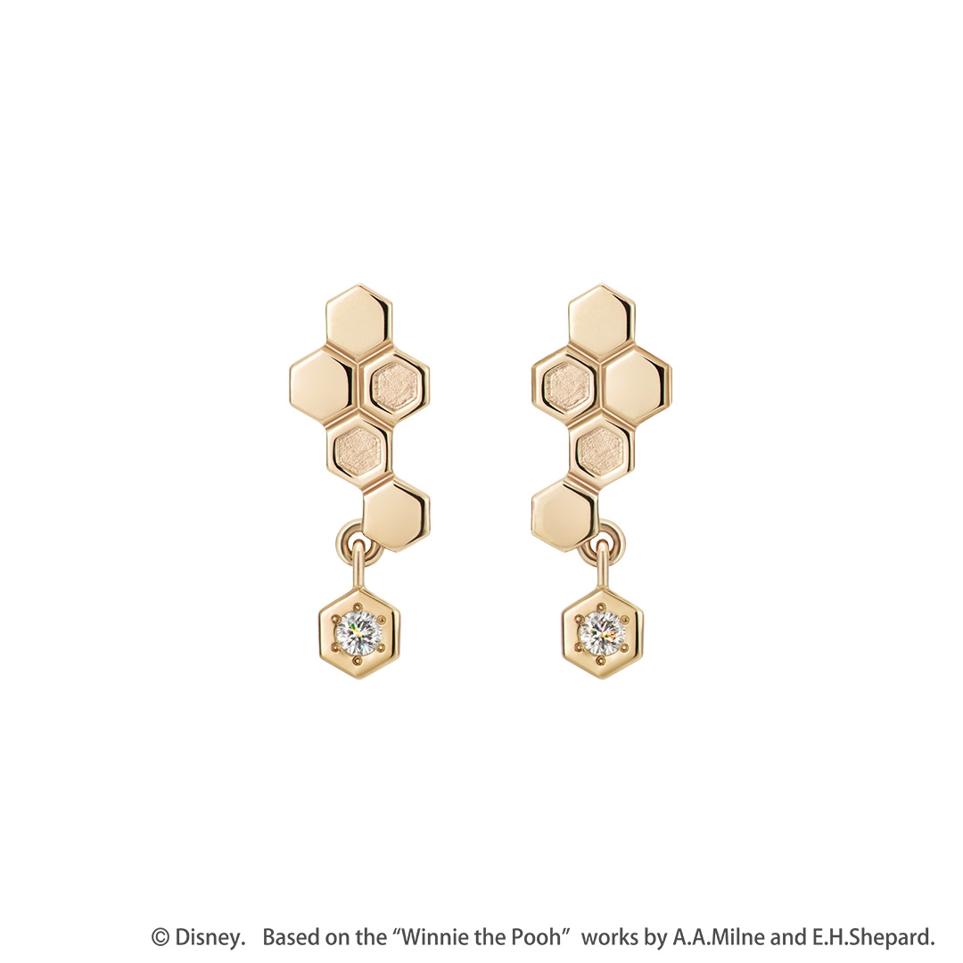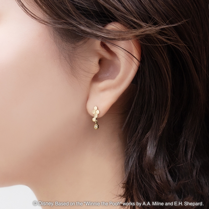 ハニカムモチーフが連なったデザインのピアス。一番下のハニカムチャームには、さりげなく輝くメレダイヤモンドを。チャームの裏には、「プーさん」とハニーポットのモチーフをデザインしました。K10イエローゴールドは肌なじみが良く、身に着けやすいカラーです。