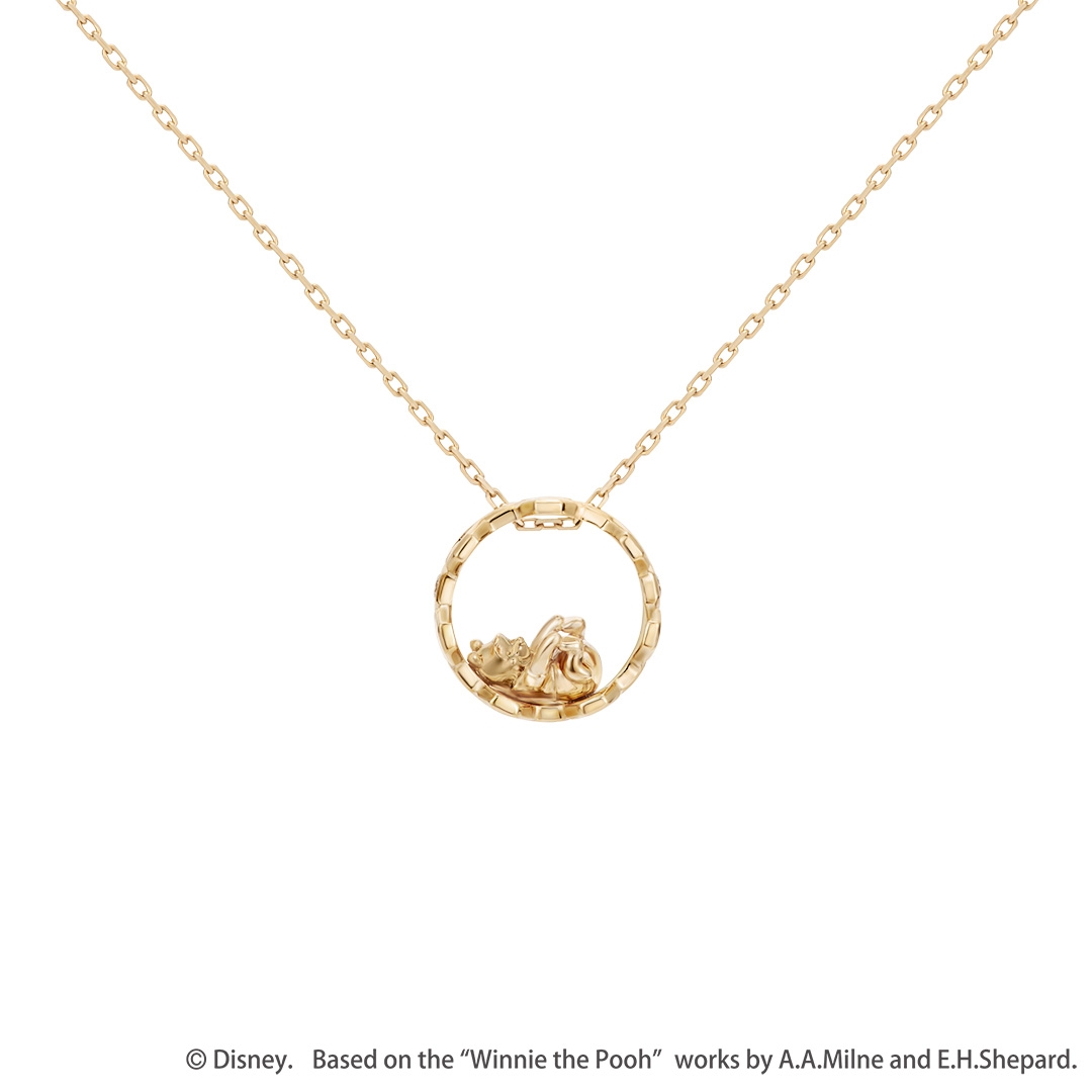 「プーさん」の大好物であるはちみつがいっぱいのハニカムをモチーフにしたネックレス。その中で、可愛さいっぱいの笑顔でコロンと寝ころぶ「プーさん」をイメージしています。ハニカムに添えたメレダイヤモンドが、大人の上品さを演出。チェーンを通す位置により、2パターンの使い方が楽しめます。