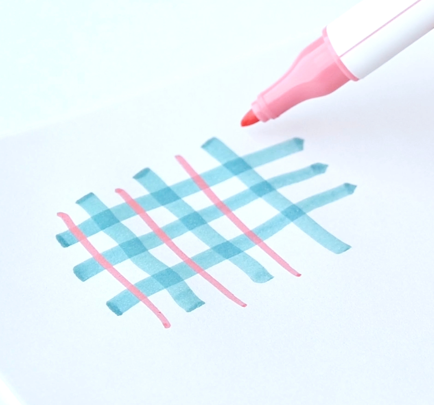 ペンの左右にマーカーペンと細ペンがついていて、それぞれ2つの色を重ねて書いても文字や線が滲まず描くことができます。