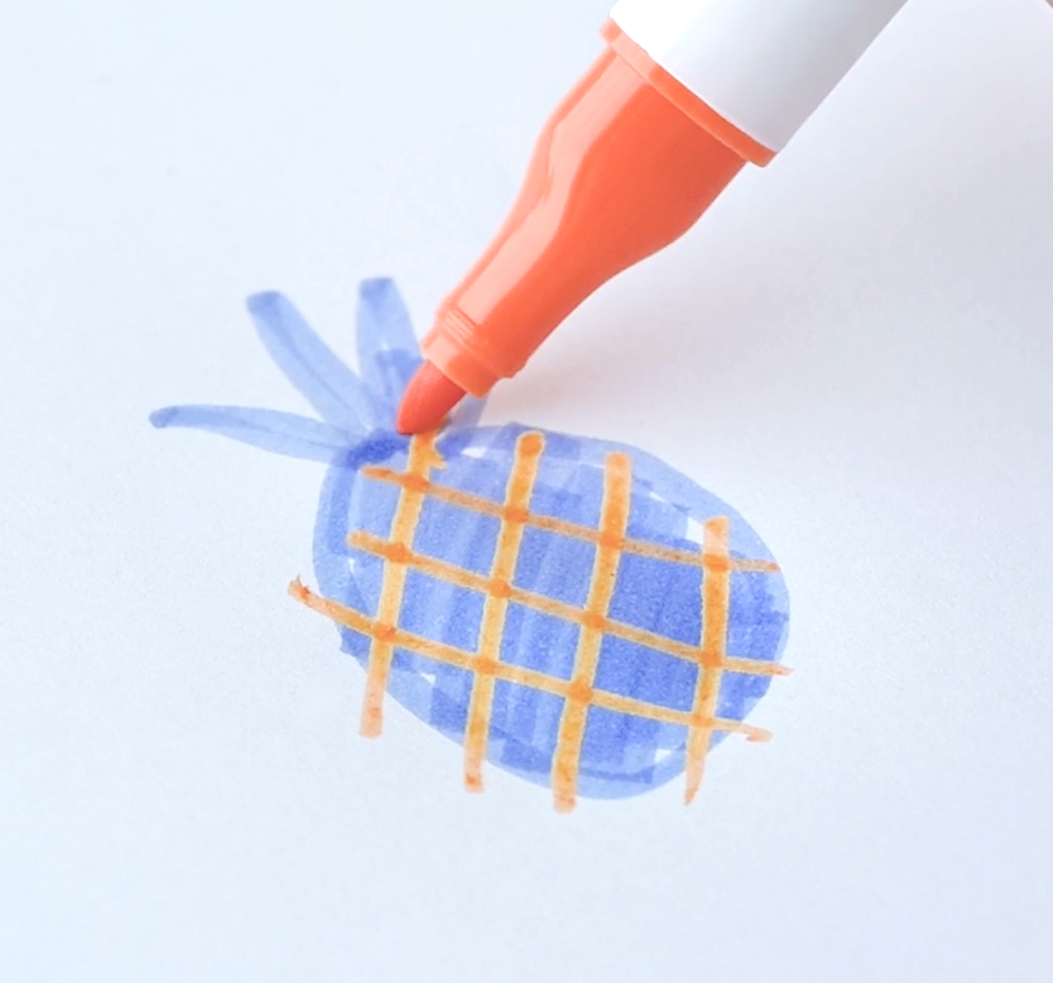 マーカーペンで引いた上に細ペンで文字を重ねても、細ペンで書いた上からマーカーペンを重ねても、きれいにインクが発色します。それぞれのマーカーペンと細ペンのインクの化学反応によって、きれいに発色し、滲まずに重ね書きができる仕組みです。それぞれ1色だけでも書くことができ、ツインマーカーとしても使えます。