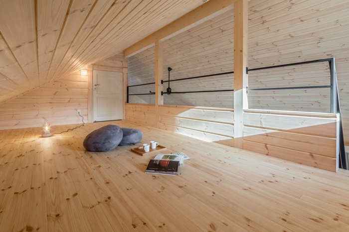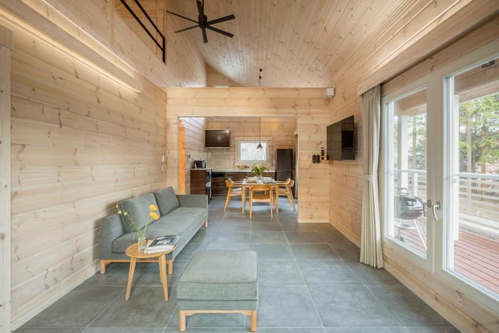 当建物は、断熱・蓄熱に優れた厚さ134mmの高品質なフィンランド産パイン材を使用したランタサルミ社のログハウスを採用。木の香りに包まれた、90平米のリラックスできる空間に2つのベッドルームとロフト、キッチン、バス、トイレ、洗面、リビング・ダイニングルーム、屋根付きテラスを備えています。床は滑りにくいタイルを使用しているため、ヒトにもワンコにもやさしい設計となっております。全館空調とペレットストーブで、年間を通して快適にお過ごしいただけます。
