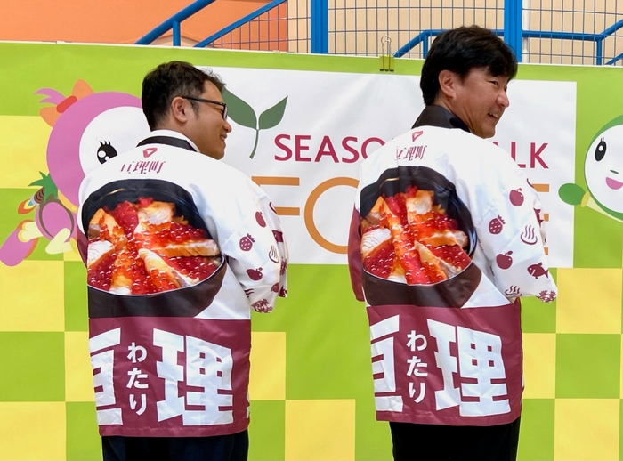 北海道開拓の為、亘理伊達家から多くの人が移り住み現在の北海道伊達市が築かれた。これに対し伊達も「自分のルーツかもしれない亘理町に来ることが出来て感慨深いです。昨日は亘理町で名物のはらこ飯をいただきました。脂がのっていて非常に美味しいので皆さんもぜひ食べに来て欲しいです。」とPR。はらこ飯は江戸時代伊達政宗に献上されその美味しさに絶賛したという、亘理町の郷土料理で9月から11月が旬。職員らは“ふるさと姉妹都市 北海道伊達市出身 伊達悠太”と書かれたオリジナルの法被を着て登場。背中には、大きくはらこ飯がプリントされており、会場からも大きな拍手が沸き起こった。