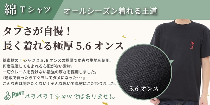 Tシャツは、5.6オンスの極厚で丈夫な生地を使用し、「よれない・透けない・長持ちする」という三拍子が揃った上質な一枚に仕上げています。さらに、丈夫な首まわりを実現するため、首まわりの縫製には「ダブルステッチ」を採用しており、長年愛用いただいてもきちんとした首まわりを保ちます。
