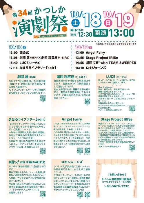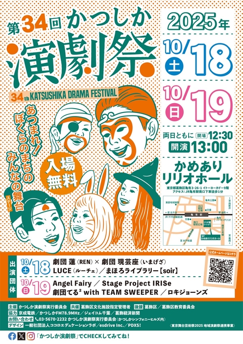 「第34回かつしか演劇祭」が2025年10月18日(土)・19日(日)にかめありリリオホール(JR亀有駅下車徒歩3分、イトーヨーカドービル9F)にて開催されます。