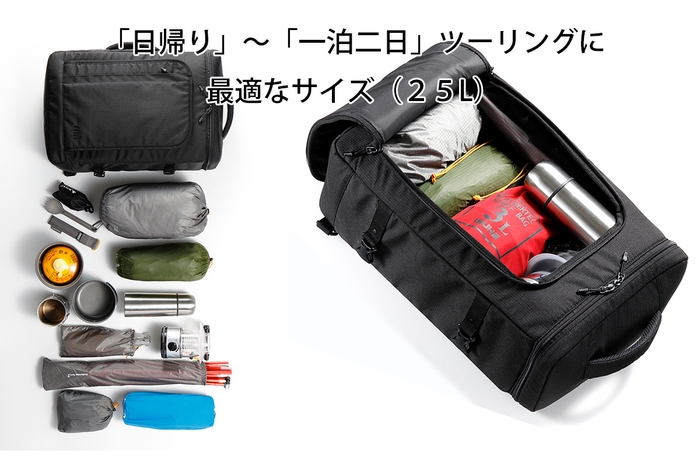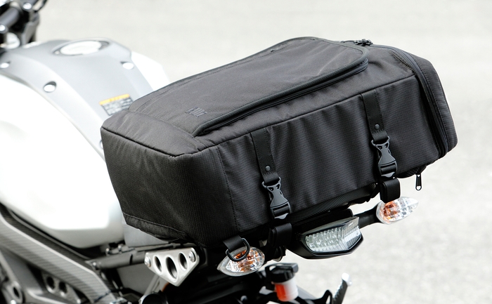 日帰りから一泊二日ツーリングに適した25Lの容量を確保。人気のスクエアフラット形状で2つの開口部から荷物の整理が簡単に行えます。バッグの装着には、「強固な固定」と「安全性」に拘り、取り付けベルト(2本)と補助バンド(1本)を設定。この組合せにより安定した装着を実現致しました。