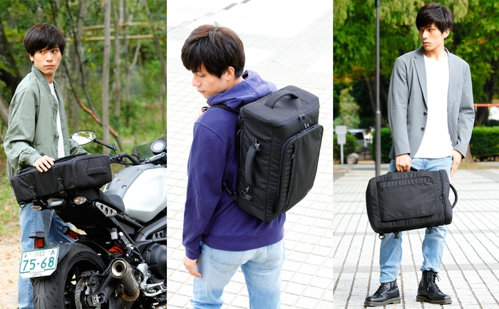 バイクに装着して【シートバッグ】として、ショルダーベルトを引き出せば【バッグパック】として、そして横持ちハンドルで【ビジネスバッグ】としてご利用いただけます。