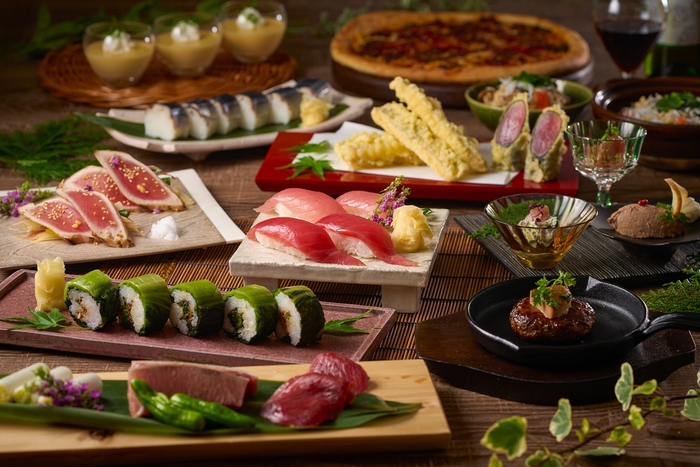 「ゆったりと、たおやかに。」お食事を楽しんでいただけるよう、各テーブルの間隔にゆとりを持たせ、今まで以上にゆったりと食事をお楽しみいただけるようにリニューアル。夕食バイキングでは、那智勝浦町の勝浦漁港で水揚げされた生まぐろのお造りや握り寿司はもちろん、まぐろ希少部位コンロ焼きやまぐろを使ったアミューズなど、ご当地の海の幸を思う存分ご堪能いただけます。また、海鮮だけでなく、熊野牛入りハンバーグ ロッシーニ風や熊野牛のピザなど、ご当地牛を使用したメニューもご用意いたします。