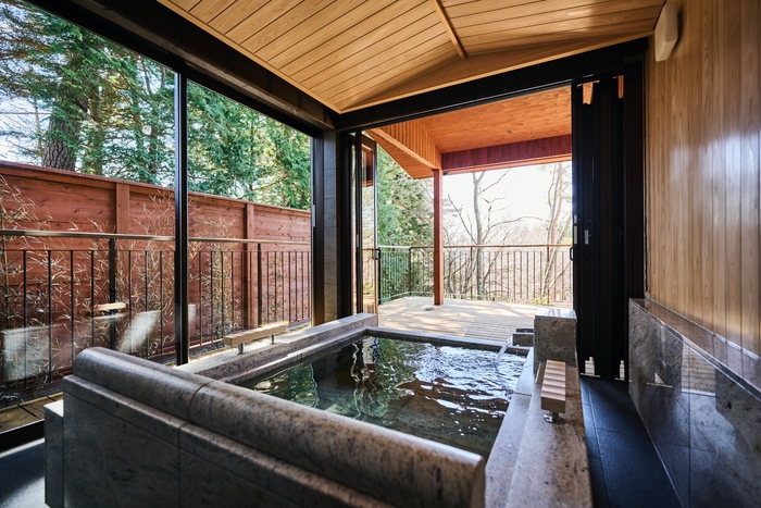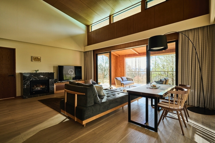 ヴィラのリビングルームには、炎がゆらぐガス暖炉と床暖房が備わり、大きな窓の外は広いテラスから森へとつながっています。森の澄んだ空気を深呼吸し、美食を堪能しながら、温かく心地よい部屋と温泉風呂で至福の時をお過ごしください。