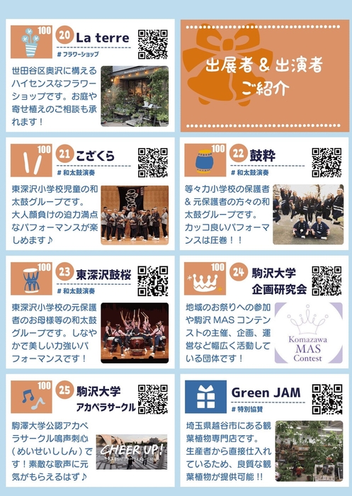 Mr.FARMER 駒沢オリンピック公園店、チームこざくら、東深沢鼓桜、鼓粋、駒沢大学企画研究会、駒沢大学アカペラサークル鳴声刺心、GREEN JAM、La terre、駒澤大学禅文学歴史博物館、長谷川町子美術館、向井潤吉アトリエ館、