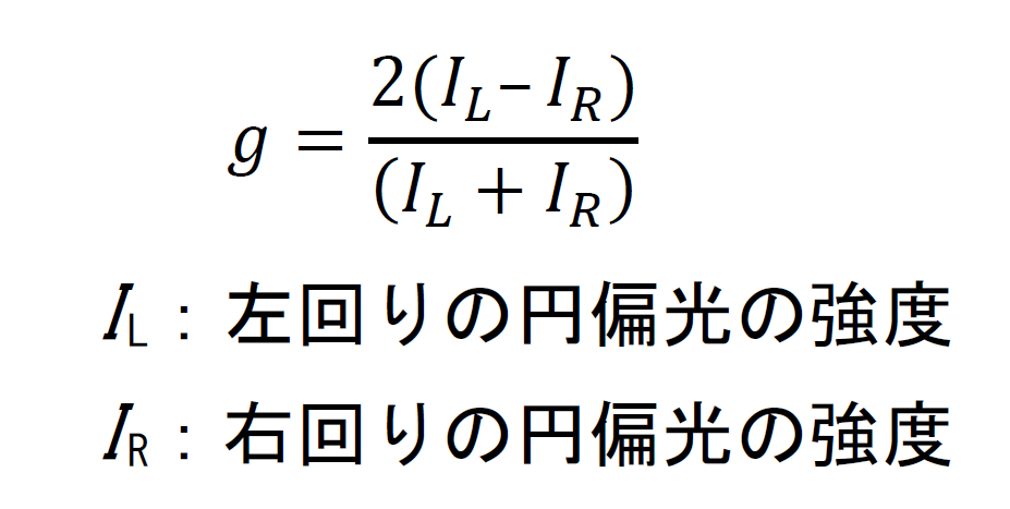 円偏光発光(CPL)や円二色性スペクトル(CD)などにおいて円偏光の純度を評価するための指標。左回りの円偏光の強度と右回りの円偏光の強度を右記の式で規格化したもの。