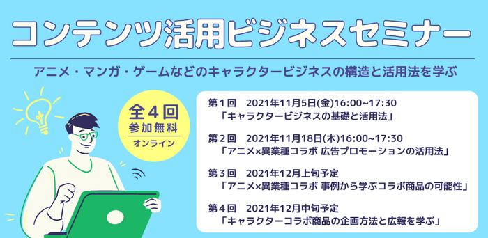 「コンテンツ活用ビジネスセミナー」は、ゲーム・マンガ・アニメ・映画などのコンテンツ産業が集積する京都市の強みを活かし、全4回で開催するプログラムです。キャラクターを活用したビジネスを検討する方を対象とし、キャラクタービジネスの基礎から企画の立案、広報まで幅広い専門知識を学びます。