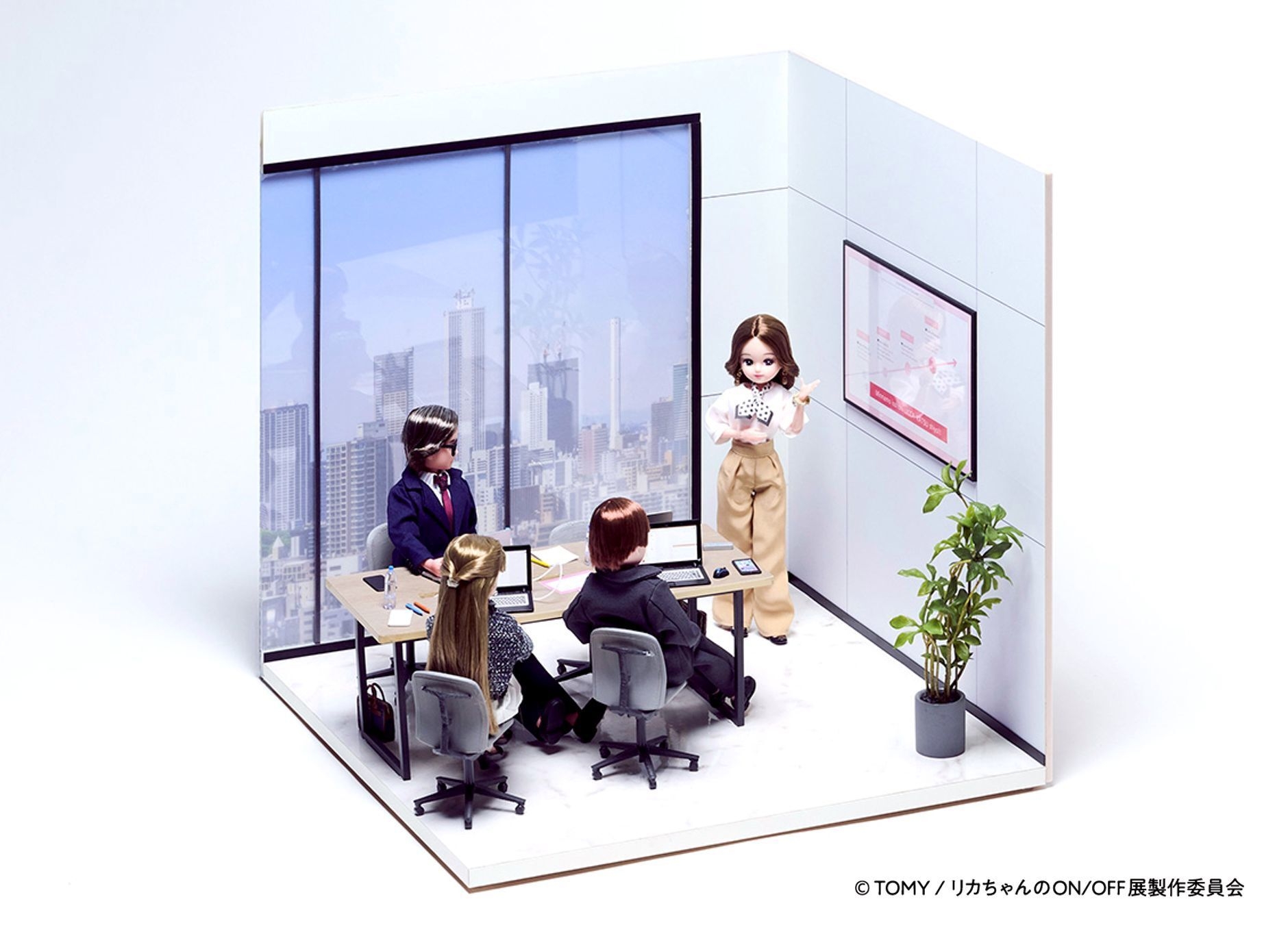 キラキラしたオフィスでおしゃれに働くONモードの「リカちゃん」、在宅ワークではスウェット姿でリラックス全開のOFFモードの「リカちゃん」など、小物のディティールまで作り込まれた“現実味満載”のジオラマが数十点。展示はすべて撮影可能で、思わず写真に収めたくなる世界観をお楽しみいただけます。