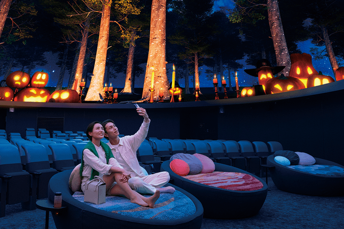 対象作品の鑑賞券をご購入後、プラネタリウムドームに入場してから作品が上映されるまでの間『ハロウィンウェルカムドーム』をお楽しみ頂けます。ウェルカム映像の上映中は写真撮影もお楽しみいただけますので、開場後はぜひお早めにご入場ください。ご購入された座席に寝転んでの鑑賞がおすすめです。