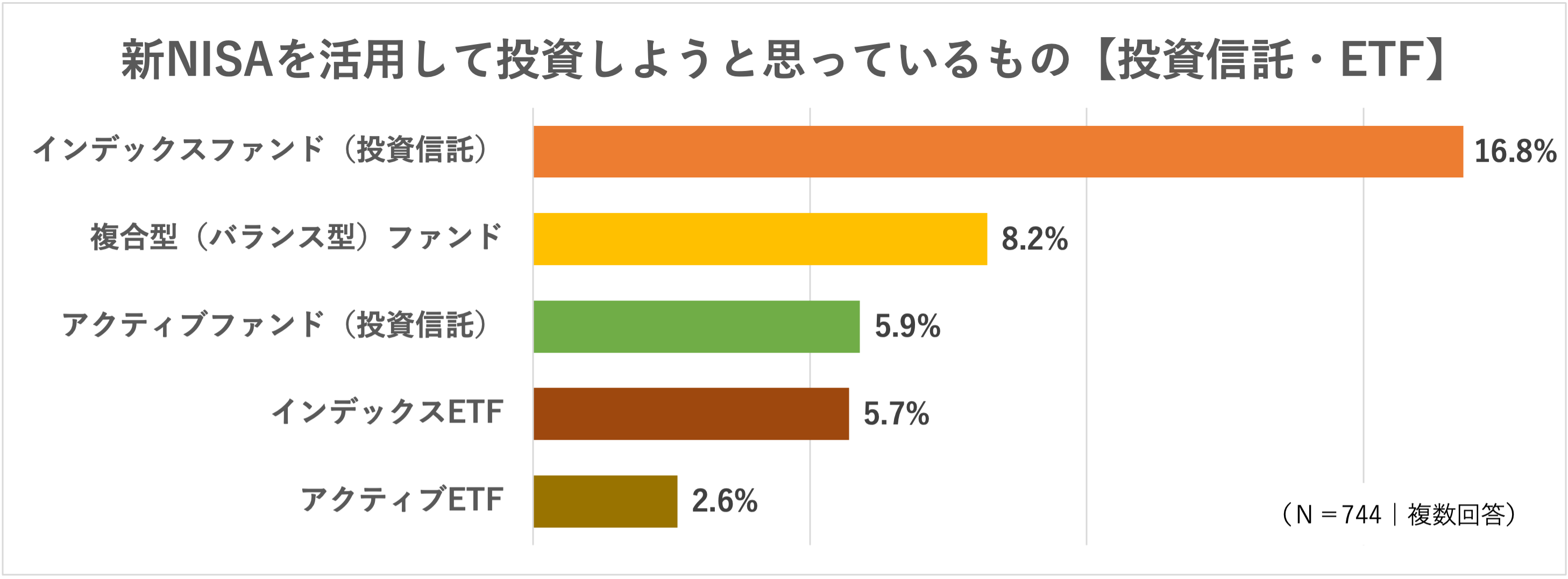 投資信託・ETFのタイプでは「インデックスファンド」が16.8%と最も人気が高く、回答率で「高配当株・連続増配株」を上回りました。総じて、ETF(上場投資信託)よりも投資信託のほうが人気であることがわかります。