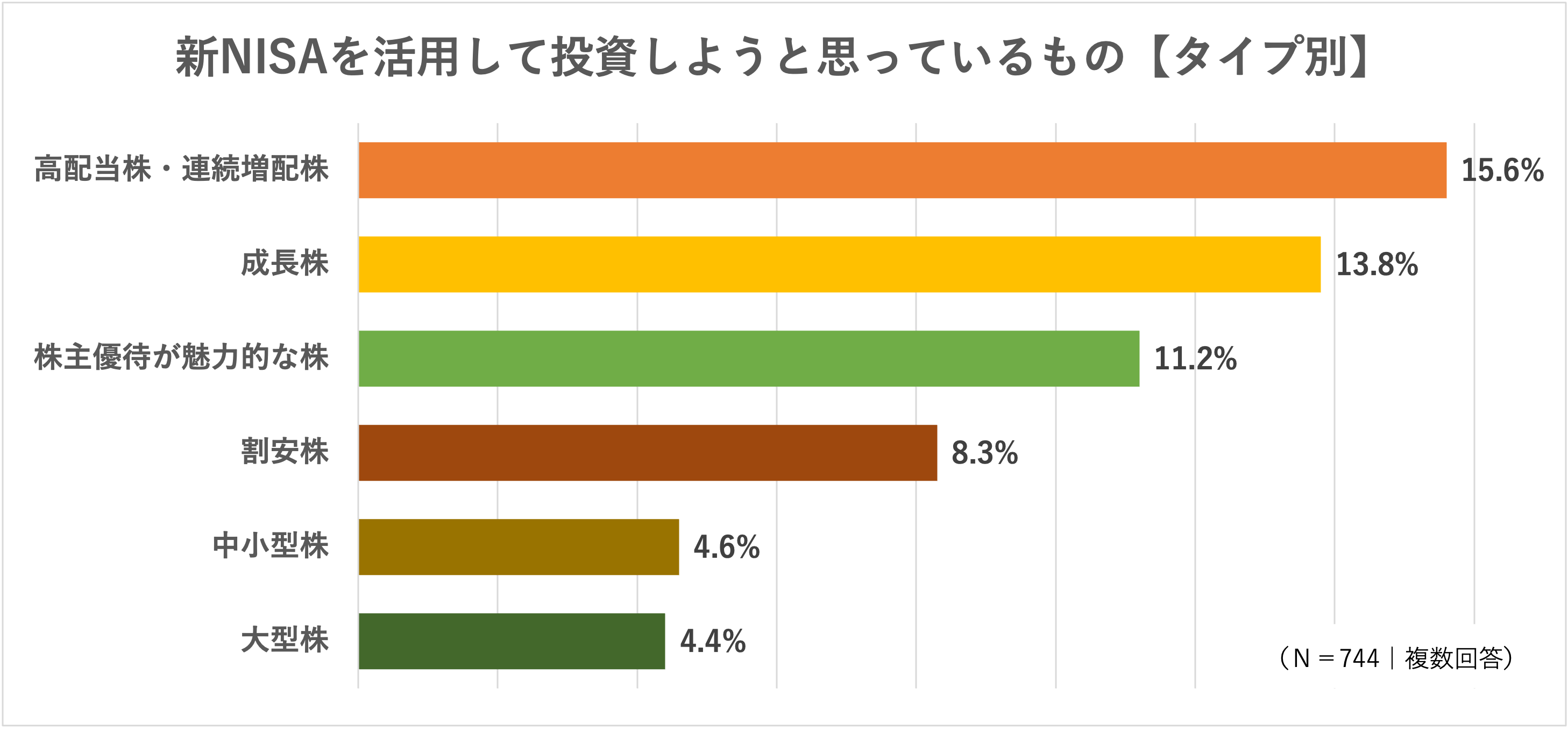 「新NISAを活用して投資しようと思っているもの」について、株式(銘柄)のタイプ別に見ると、「高配当株・連続増配株」が一番人気で15.6%、次いで「成長株」13.8%、3番目に入ったのは「株主優待が魅力的な株」の11.2%という結果になりました。