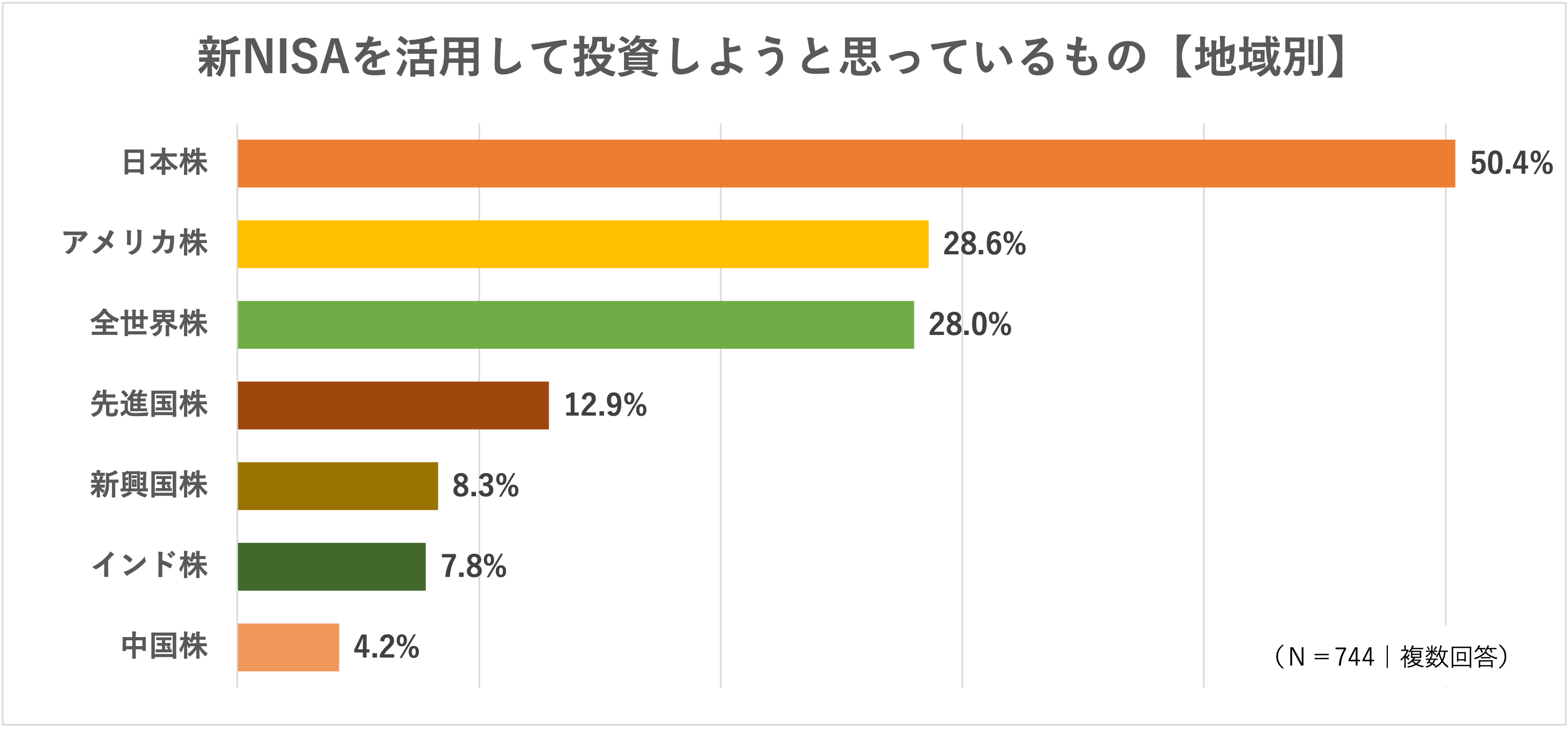 新NISAを活用して投資しようと思っているものについても調査しました。数ある選択肢の中から最も多くの票を集めたのは「日本株」で、新NISAを活用すると答えた(予定も含む)744人のうち、およそ半数にあたる50.4%の人が選びました(複数回答)。
