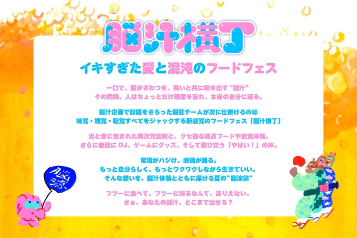 『脳汁横丁』の企画監修には、『脳汁銭湯』『脳汁スタンド』に引き続き、クリエイティブディレクター・イベントプロデューサー・DJとして幅広く活躍するクリエイター アフロマンス氏を起用。「脳涼祭」のコンセプトのもと、2024年5月に実施し、12,000人以上のお客様にご来場いただいた「イキすぎた愛と欲望のフードフェス『偏愛横丁』」をさらにバージョンアップした五感で楽しむ新感覚のフードフェスです。会場内では屋台風フードトラック、無数の提灯でライトアップされたメインステージなど、夏祭りを想起させる演出と世界観で納涼祭ならぬ「脳涼祭」の気分を盛り上げます。『脳汁横丁』に関する詳細情報については今後の情報発信をお待ちください。