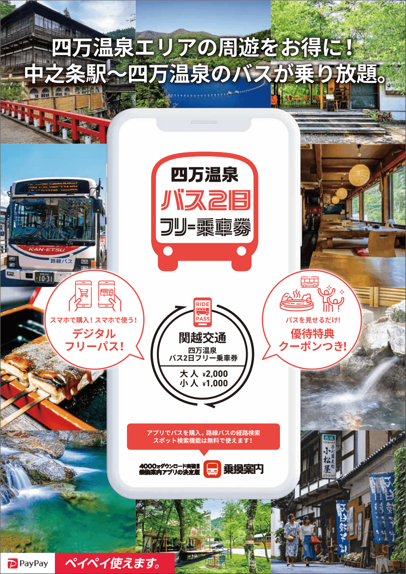 きっぷ購入のための窓口探しや時間にとらわれることなく、「渋川・伊香保温泉 バスフリー乗車券」「四万温泉 バス2日フリー乗車券」がキャッシュレスで購入できるため、スマートフォン1つで、伊香保や四万温泉エリアの移動がより便利になります。