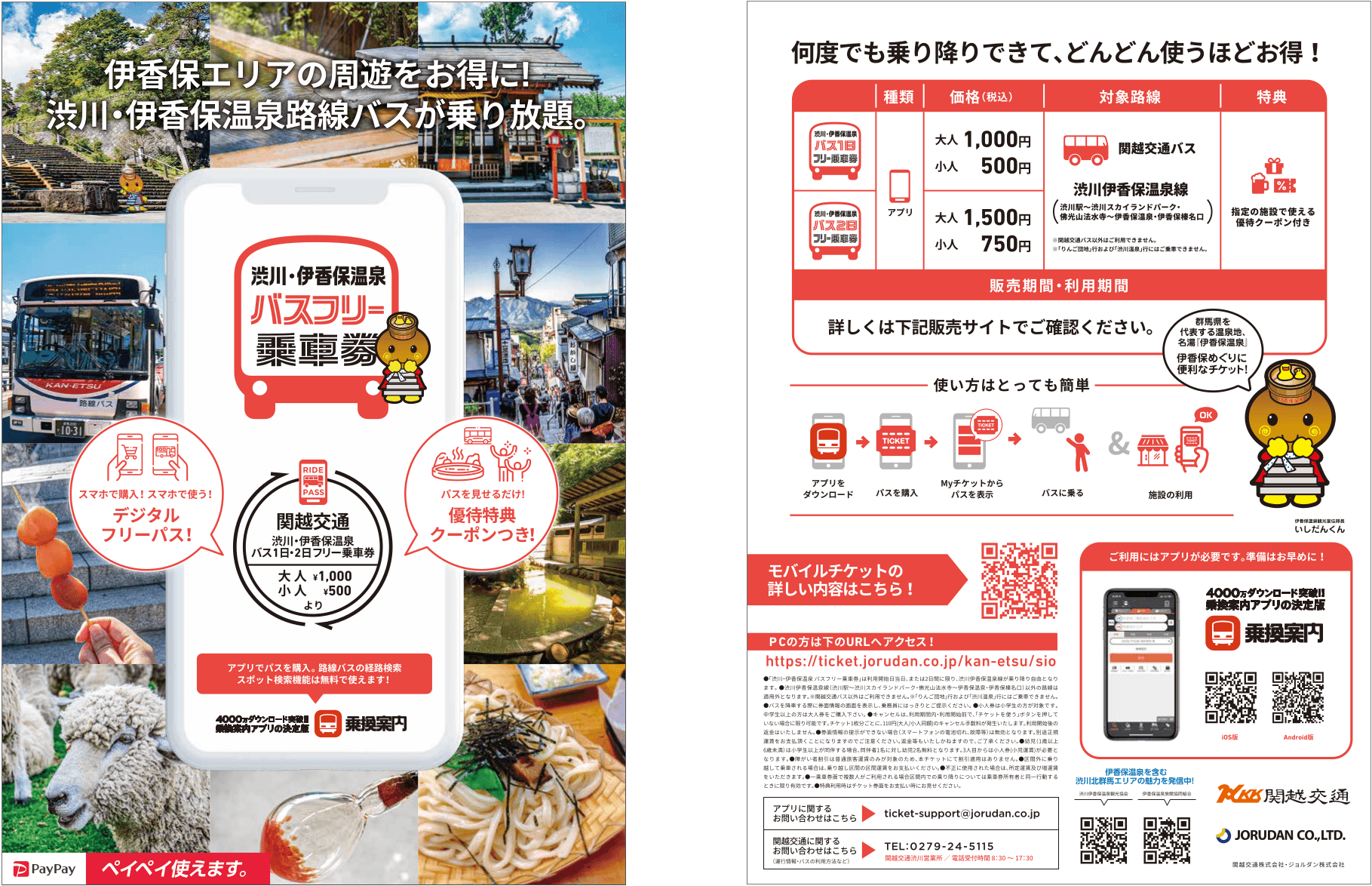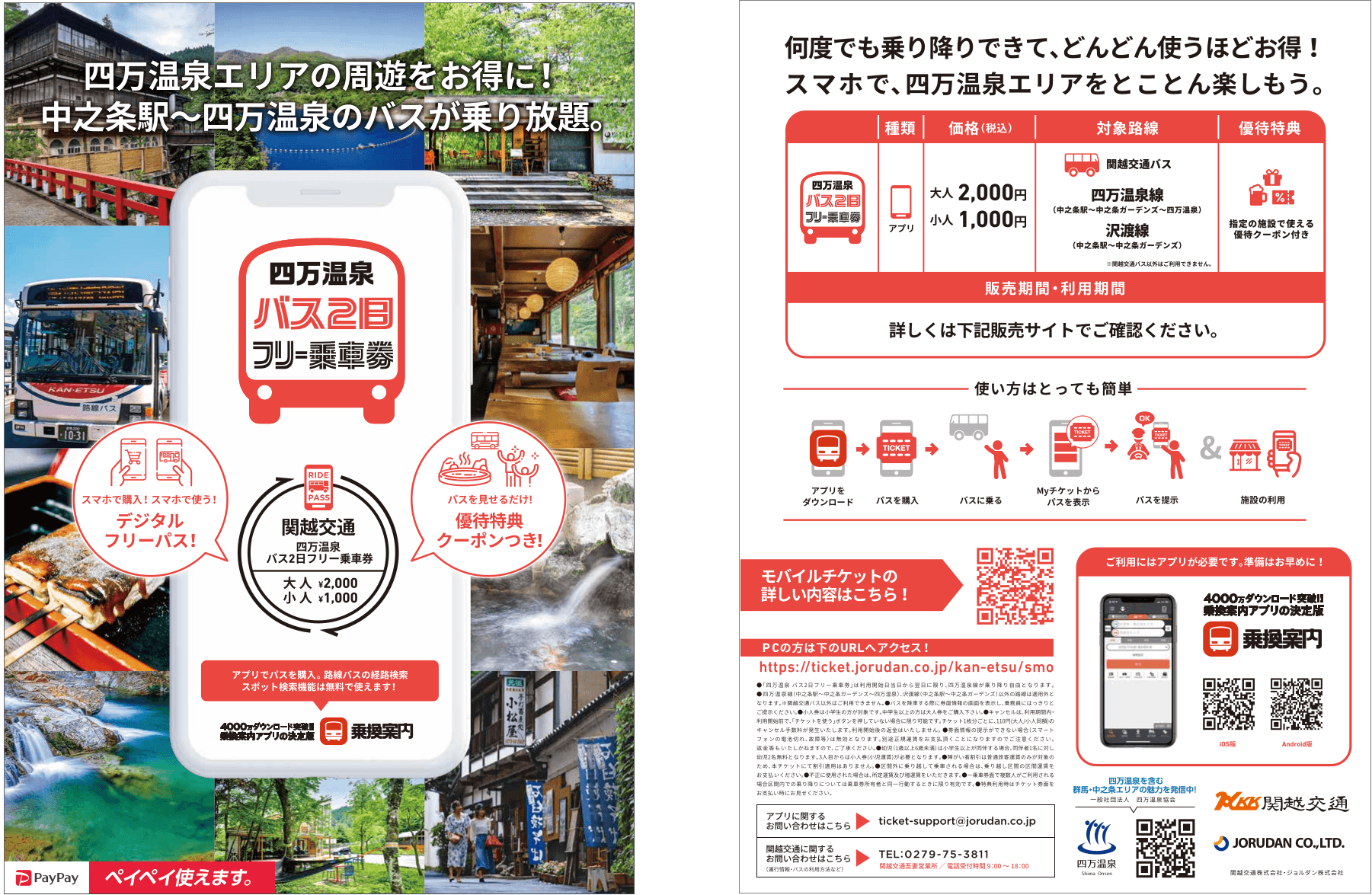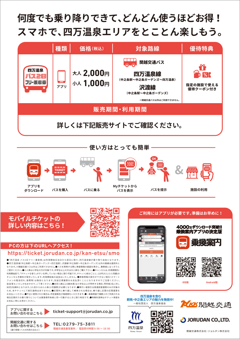 ジョルダン株式会社(本社:東京都新宿区、代表取締役社長:佐藤 俊和、以下「ジョルダン」)は、2023年11月10日(金)より、関越交通株式会社(本社:群馬県渋川市、取締役社長:佐藤 俊也、以下「関越交通」)が企画・運行する「渋川・伊香保温泉 バスフリー乗車券」「四万(しま)温泉 バス2日フリー乗車券」をスマホで買えるモバイルチケットで販売開始します。