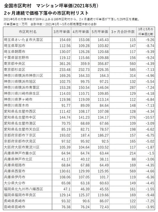 ・2021年3月から2ヶ月連続で下落したのは29市区。