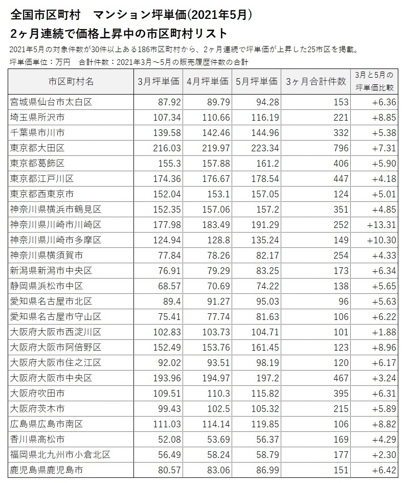 ・2021年3月から2ヶ月連続で上昇したのは25市区。