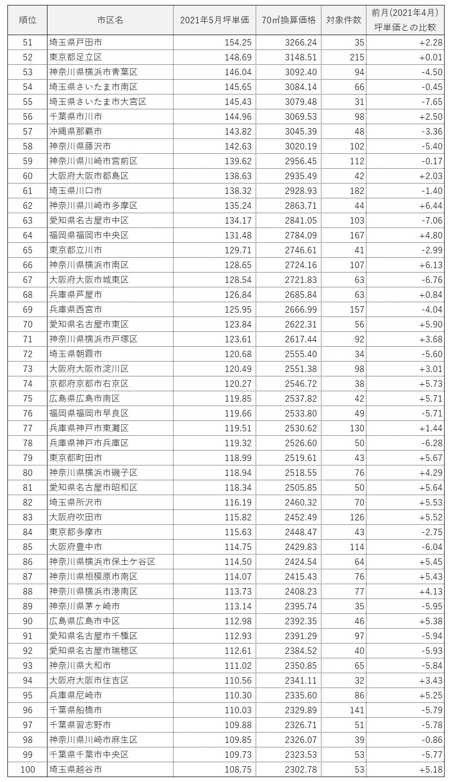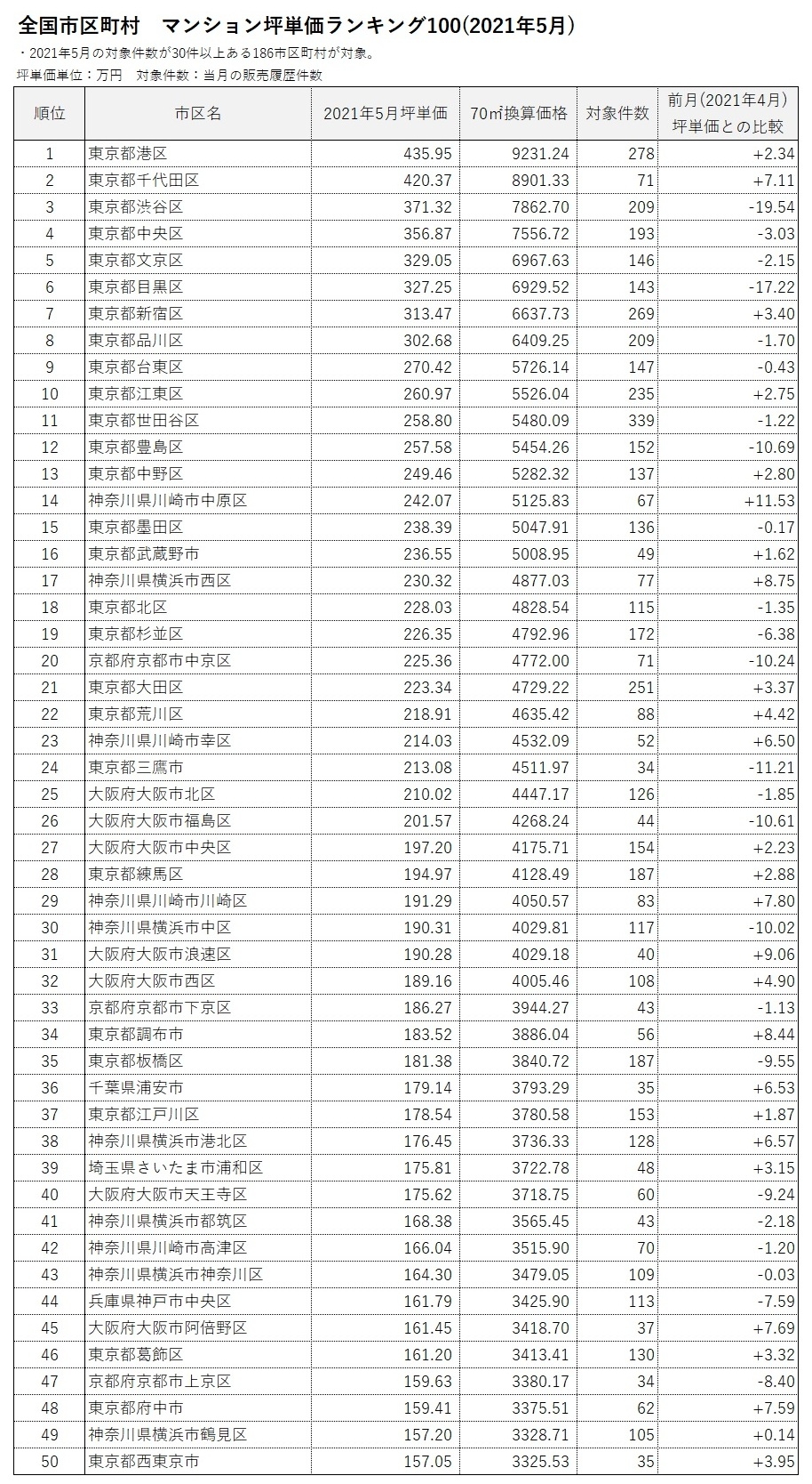 「マンションレビュー」2021年5月 全国市区町村 マンション坪単価 ランキング100を発表