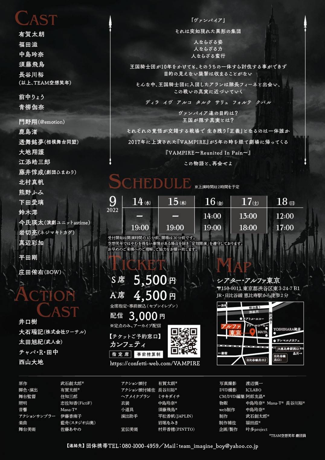 TEAM空想笑年(代表:武石創太郎)主催、TEAM空想笑年第十回公演『VAMPIRE~Reunited In Pain~』が2022年9月14日 (水) ~2022年9月18日 (日)にシアター・アルファ東京(東京都渋谷区東3-24-7B1F)にて上演されます。