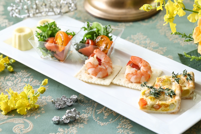 ・セイボリー: 宮廷庭園モチーフ フリルレタスとスモークサーモンのサラダ / トマト&シュリンプカナッペ セサミドレッシング / ベジタブルキッシュ