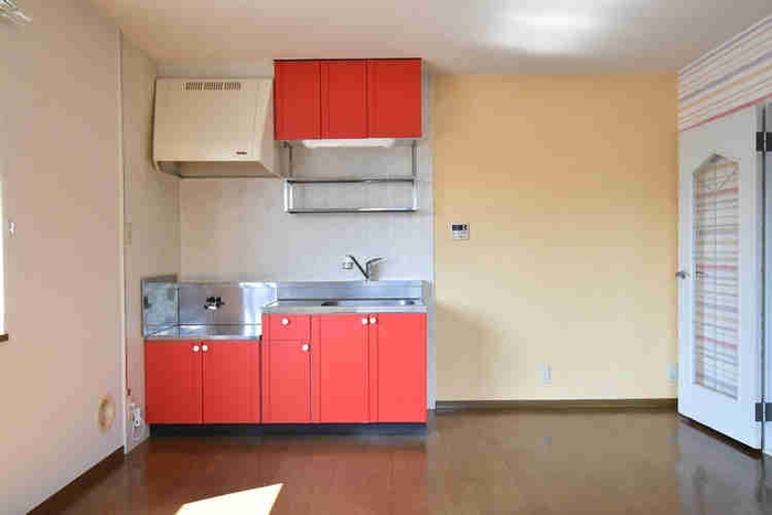 リノベーション後のLDKは、キッチン本体は同じではありますが、無垢材扉やペンダントライトを設置しているので、見違えるぐらいおしゃれなキッチンとなりましたが、床材を白系のクッションフロアを施工したので、室内空間が明るくなったばかりではなく、室内に白系を用いることによって、室内空間を広く見せる効果が期待できますので、家具などを置かれても圧迫感を感じることはありません。