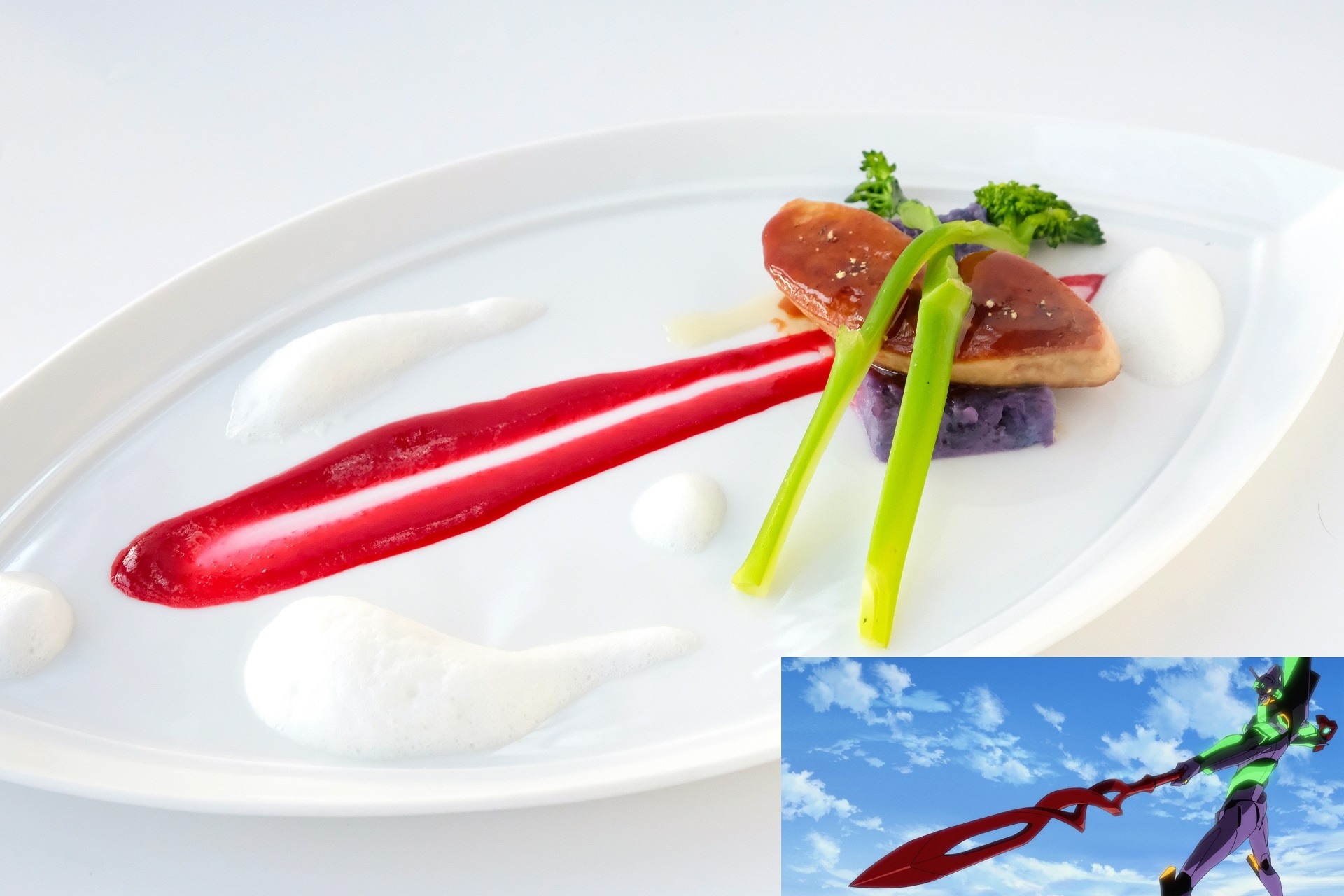 カシウスの槍を持ったエヴァンゲリオン初号機を模した伝統的な前菜フォアグラのポワレ。赤はフォアグラと相性のよいフランボワーズのソース、胴体の緑は旬を迎える山口県産オリジナル野菜「はなっこりー」、紫はシャドークイーンをマッシュしたエクラゼ、そしてトリュフ風味のミルクフォームで白い雲を表現。濃厚なフォアグラと甘酸っぱいソースがフルーティーで爽やかな味わいの余韻を残します。