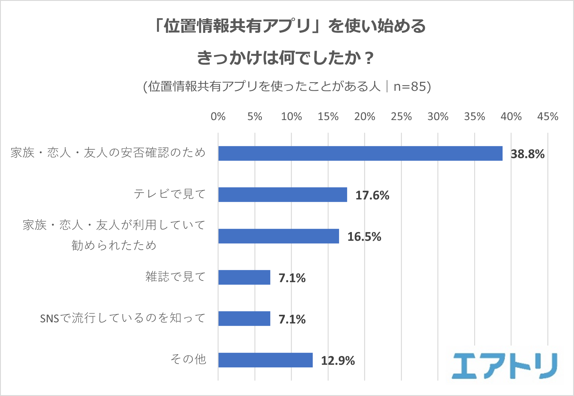位置情報共有アプリを使ったことがある人にアプリを使い始めるきっかけを聞いたところ、「家族・恋人・友人の安否確認のため」が最も多く38.8%、次いで「テレビで見て」が17.6%、「家族・恋人・友人が利用していて勧められたため」が16.5%という結果でした。