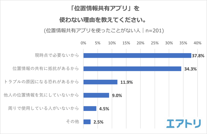 位置情報共有アプリを使ったことがない人に理由を聞いたところ、「現時点で必要ないから」が37.8%で最多となりましたが「位置情報の共有に抵抗があるから」も34.3%と僅差でした。次いで「トラブルの原因になる恐れがあるから」が11.9%という結果でした。