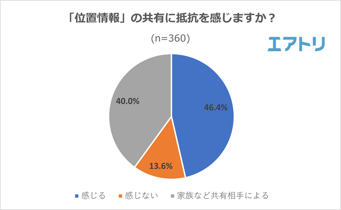 位置情報を共有することに抵抗を感じるか聞いたところ、「感じる」は46.4%、「感じない」と回答した人が13.6%でした。また「家族など共有相手による」は40.0%でした。
