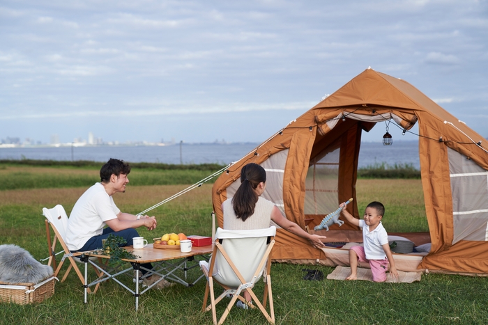 今までのファミリー向けテントは設営や撤収に時間が取られますが、エアテントは空気を入れるだけで最大5人家族でも使用でき、60秒で設営、撤収も空気抜くだけの簡単で気軽に自宅・公園・キャンプを楽しめる次世代テントです。