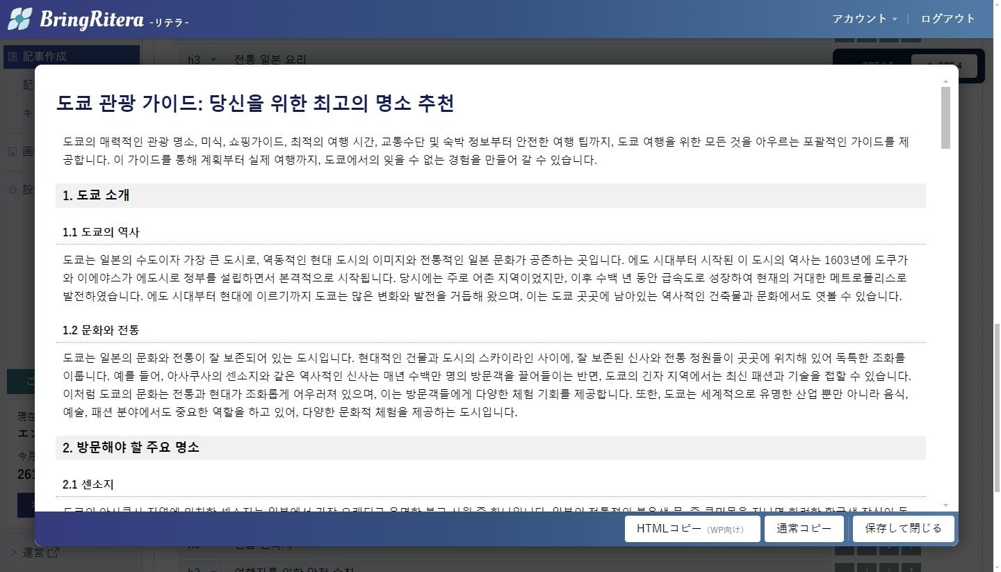 「記事本文作成ボタン」を押すと10分ほどでSEOに強い記事が生成されます。生成された記事は保存され、いつでも呼び出すことができます。HTMLコピーすればWordPressにHTMLの書式が反映されたまますぐに貼り付けることができます。