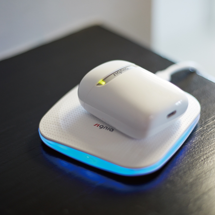 スタイリッシュでコンパクトな充電ケースは持ち運びに便利なうえ、充電パッドに置くだけでワイヤレス充電が可能です。