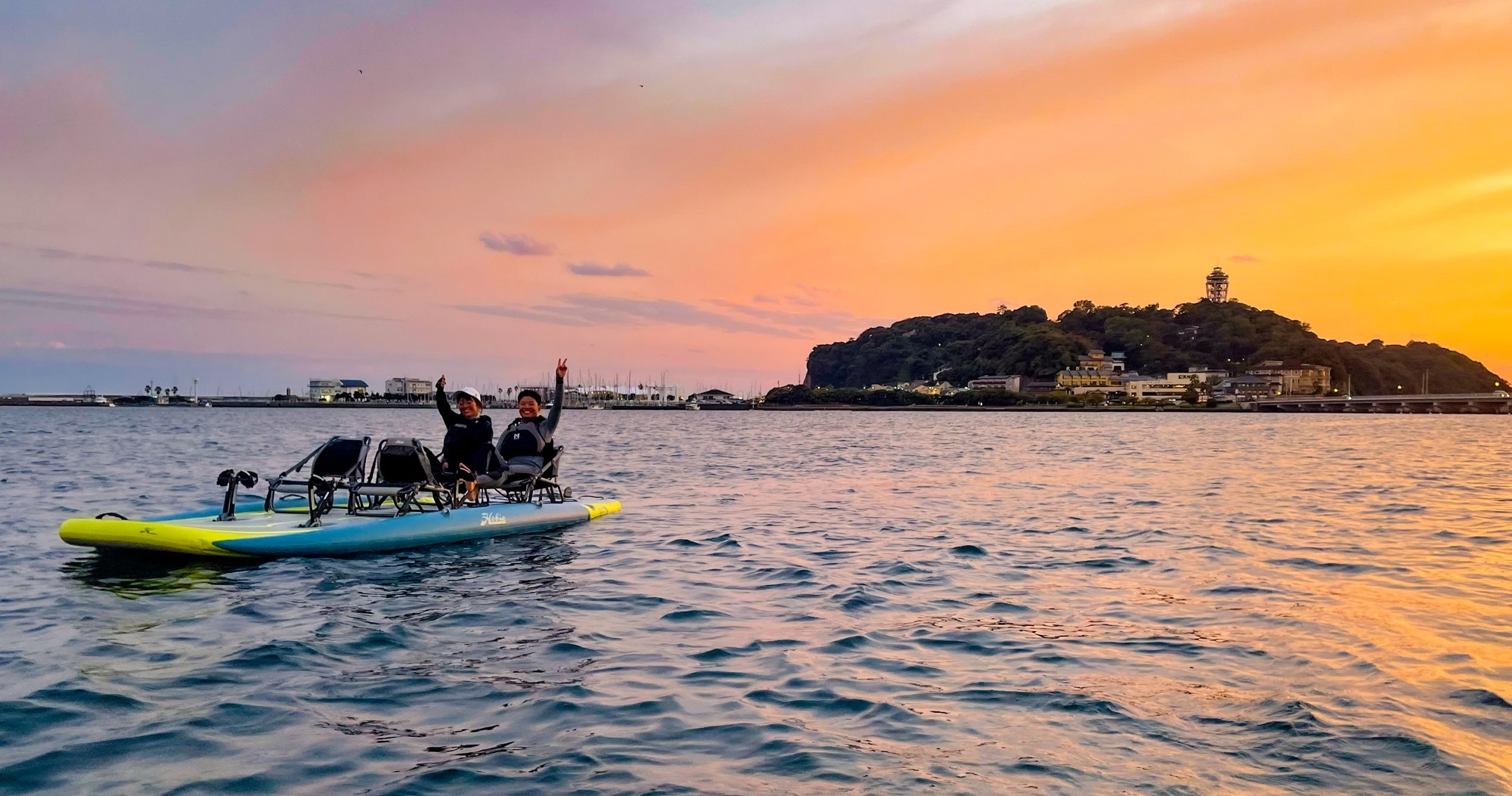 「HOBIE BASE ENOSHIMA KANAGAWA(ホビーベース エノシマ カナガワ)」は2025年5月24日に江ノ島にオープンしたHOBIEの新しいビーチレジャー拠点です。HOBIEはペダルを漕いで進むタイプの水上アクティビティで、当施設ではヨットの形状のものなど、様々な種類のHOBIEを使用したプランを提供しております。この度開始する新プラン「SUNSET HOBIE」は、江ノ島の景色や海での時間を楽しむことに特化したアクティビティプランです。私たちは、HOBIEの体験が単なるアクティビティにとどまらず、自然の中で深い呼吸を取り戻すような“癒しの時間”になると考えおり、本プランは、そうしたリラクゼーションの価値を多くの方に感じていただきたいという思いから企画いたしました。サンセットタイムでは、ゆっくりと沈む夕日と江ノ島のシルエット、赤く染まる空の幻想的な風景を望めます。HOBIEならではの静かで心地よいペダルクルージングの中、波の音と穏やかな潮風に包まれながら、日常のあわただしさを忘れてゆったりとしたひとときをお過ごしいただけます。大切な人との時間をより特別なものにする、ロマンチックで非日常のサンセットクルージング体験をお楽しみください。