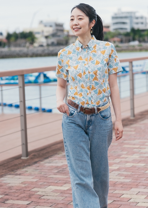 素材は、沖縄らしいデザインを織柄で表現したジャガード生地で、よこ糸にはリサイクルポリエステル糸を使用。