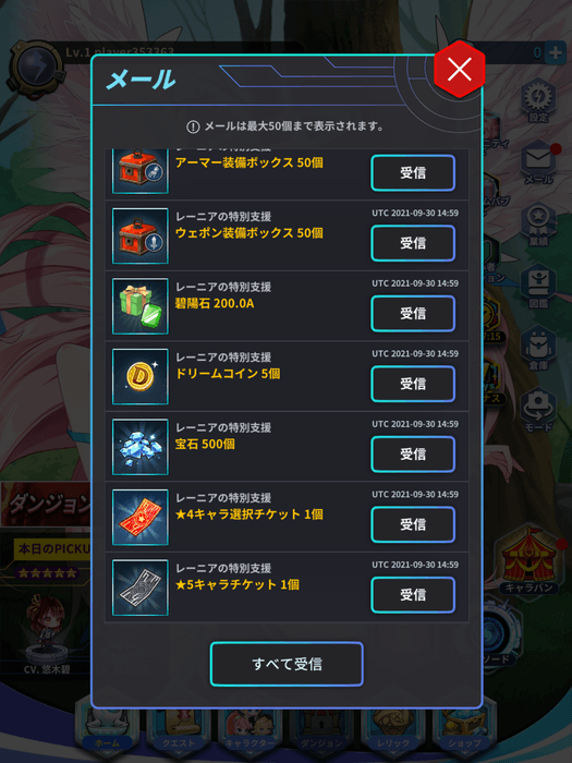 - アイテムはメールボックスより獲得してください。