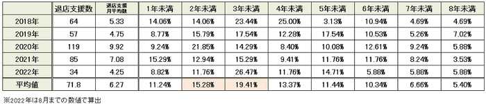過去5年間で退店支援数が最も多かった2020年は、退店支援月平均数が10店舗に届く勢いを見せており、新型コロナウイルスの影響を強く受けたことが分かります。一方で、ポストコロナと言われる2022年は、退店支援数・退店支援月平均数共にコロナ禍前よりも低い値となり、飲食店の営業持続率が回復傾向にあることが判明しました。