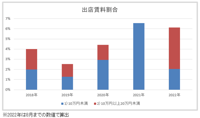 当社が過去に発表したプレスリリース(プレスリリース:店舗出店希望者の約7割が【15坪以下の物件を希望】していることが判明)でも、TRNが提供する「ショップサポートシステム」※1 を活用して出店した店舗のうち、533店舗を対象に2019年1月から2022年3月の坪単価売上の平均を調査した結果、15坪以下の店舗の平均値は57%の上回り(2021年度)を見せ、全体の平均値を全期間で上回っていることが判明していることから、賃料や広さ(坪数)を抑えることは、店舗の生存率に影響を及ぼすことが裏付けられます。