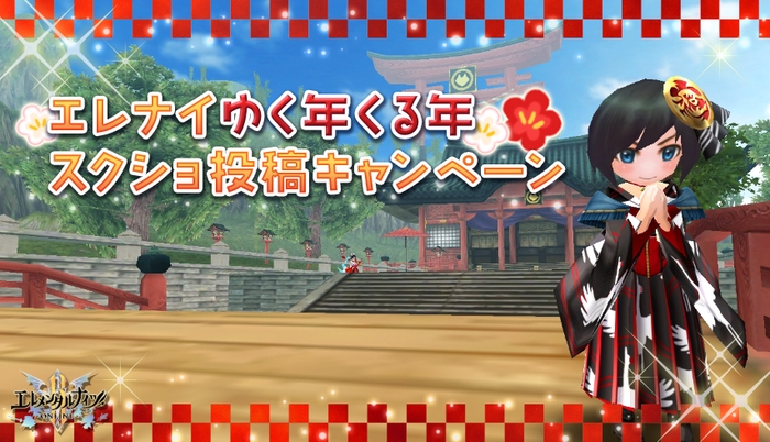 ① 「エレメンタルナイツR」ゲーム内でお正月らしい風景やおしゃれを装備してスクリーンショットを撮影