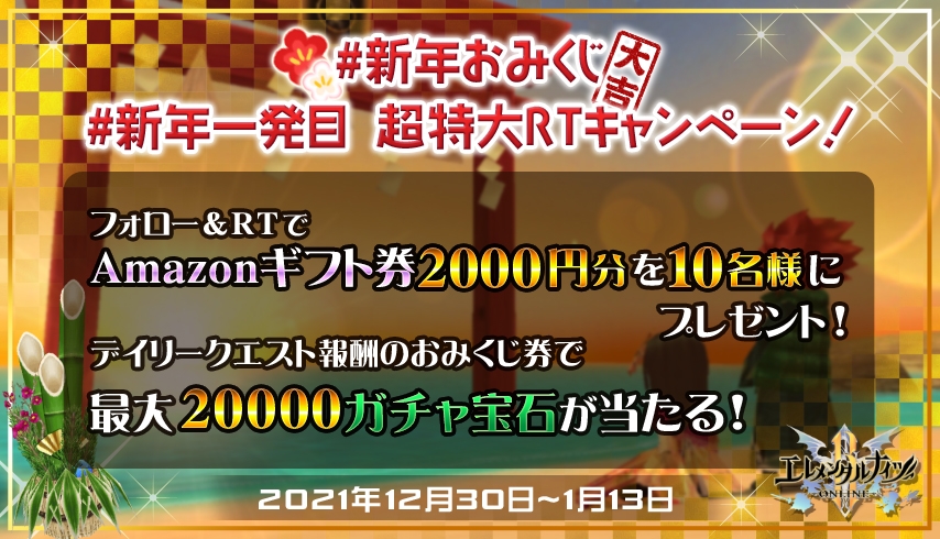 株式会社ウインライトは、本格MMORPG『エレメンタルナイツオンラインR』で、12月29日メンテナンス後より、「年末年始特別企画」を開始いたします。本キャンペーンでは、大量のガチャ宝石や冒険に役立つアイテムが手に入り、ツイッターRTキャンペーンではAmazonギフト券をGETできます。