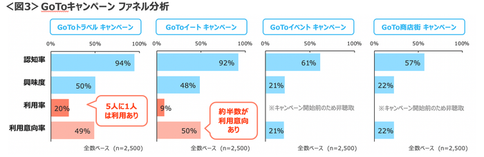 GoToキャンペーンについて「認知・興味・利用経験・今後の利用意向」をファネル分析した。認知状況は、「GoToトラベル・GoToイート」が9割と非常に高く、キャンペーン開始前の「GoToイベント・GoTo商店街」でも約6割程度にのぼる。利用状況については「GoToトラベル」が全体の20%と、5人に1人は利用しており、利用意向も「GoToトラベル・GoToイート」で全体の約半数と非常に高い関心が集まっている。<図3>直前で決められるくらいのちょっとした外出や、感染対策を十分にできると判断できた上での会食や旅行であれば出かけたい、といった気持ちが推察される。