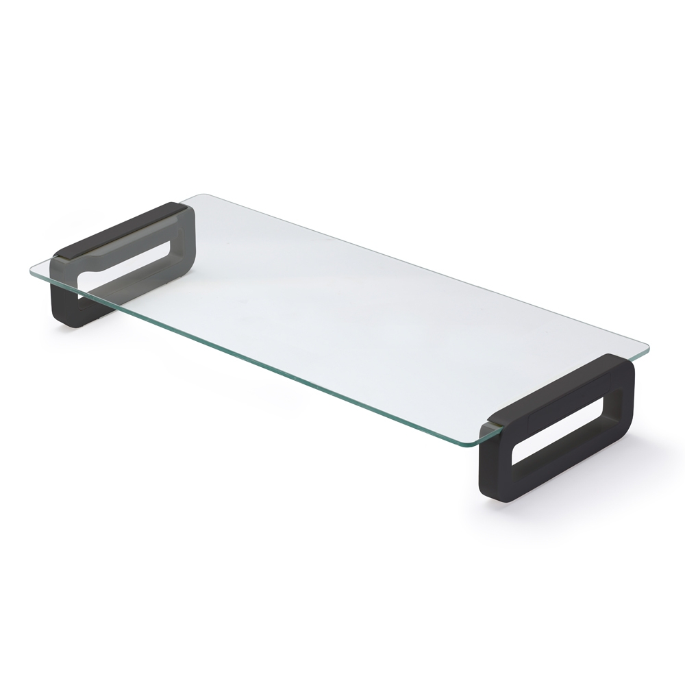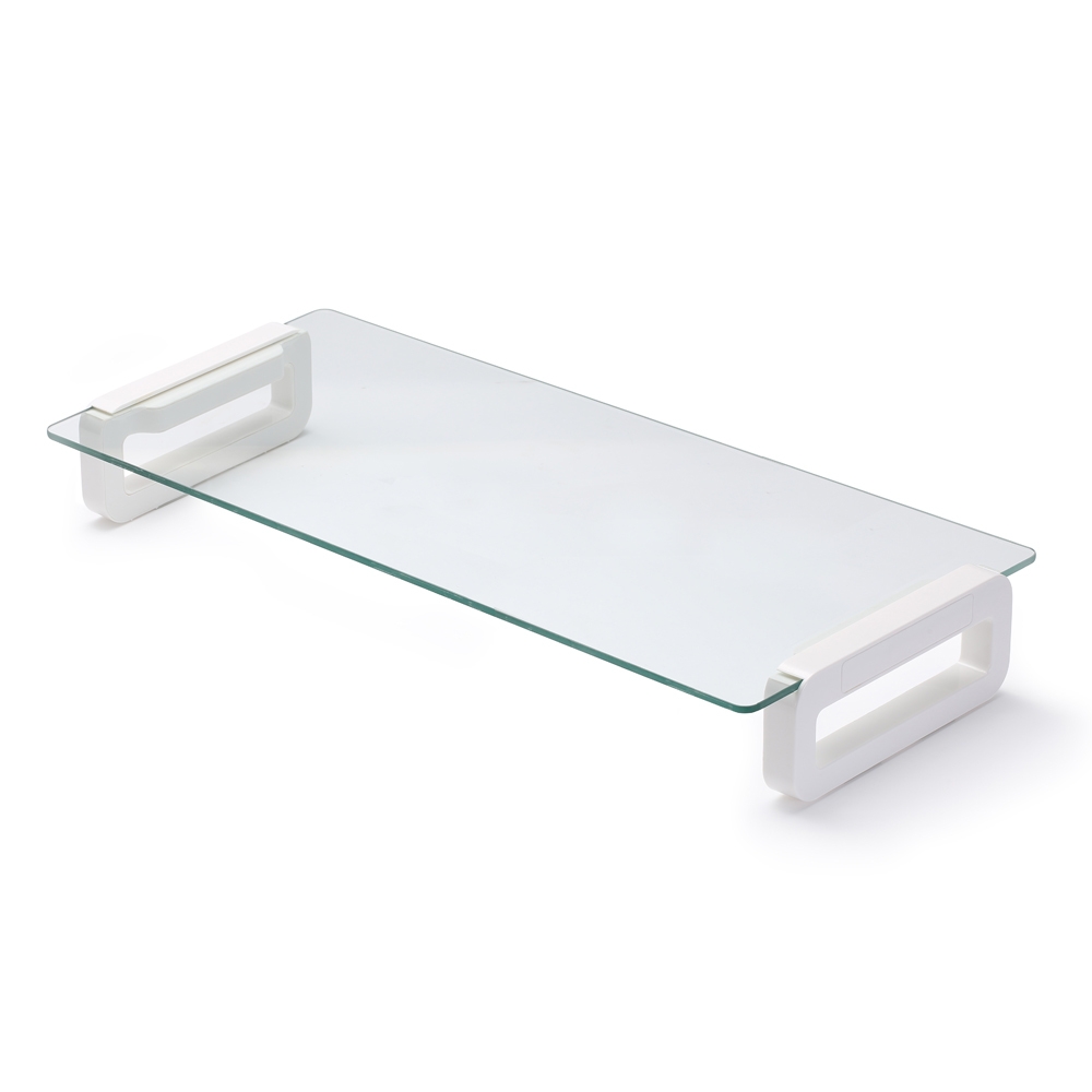 モニタスタンド「FFF-L1」は、ホワイトモデルとブラックモデルの2色のラインナップがあり、天板は幅50cm、奥行25.5cmのワイドサイズで、45cmまでのフルキーボードが天板下に収納できます。強化ガラス天板でクリアかつシャープなデザインとなっており、おしゃれなデスクを演出できます。