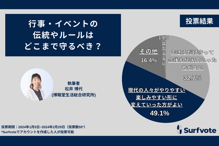 博報堂生活総合研究所、上席研究員の松井博代氏がSurfvoteで提起。「お正月の過ごし方」のような伝統・ルールを守る方がよいか?時代に合わせて変えていく方がよいか?Surfvoteで意見を集めました。