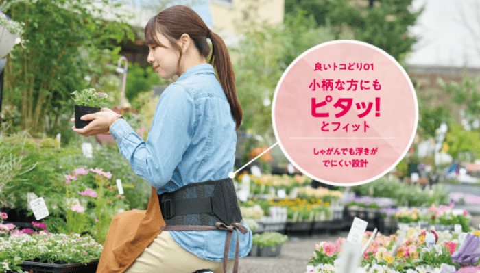 動きを邪魔しにくく、小柄な方にも食い込みにくい設計です。前かがみになった時、腰に隙間ができにくい幅とサポート力、動きやすさのバランスにこだわり、設計しました。