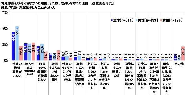 ◆育児休業未取得の理由 男性回答1位「仕事の代替要員がいない」、女性回答1位「収入が減る」