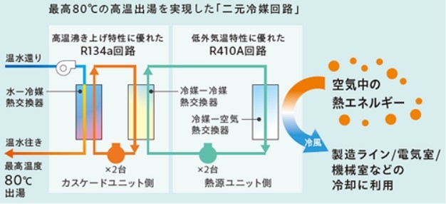 従来のヒートポンプチラーで 80℃の高温水を得ようとすると圧縮機の吐出ガス温度が高くなり、冷凍機油の炭化や機器の故障の恐れがありましたが、ニ元冷媒回路を採用し、圧縮比を下げることにより吐出ガスの高温化を防ぐことができました。