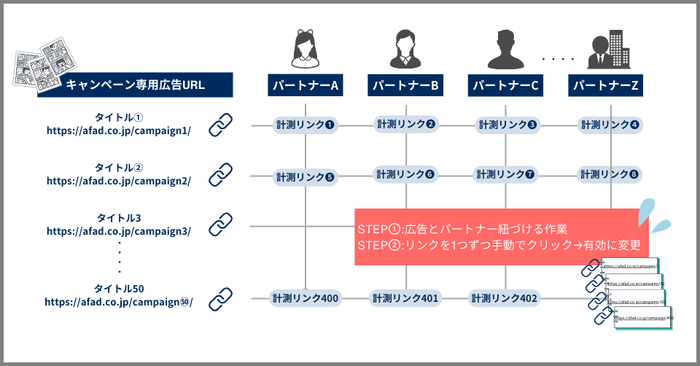 この場合、キャンペーン専用リンクと複数のパートナーを紐づけると数百個のリンクが生成されますが、